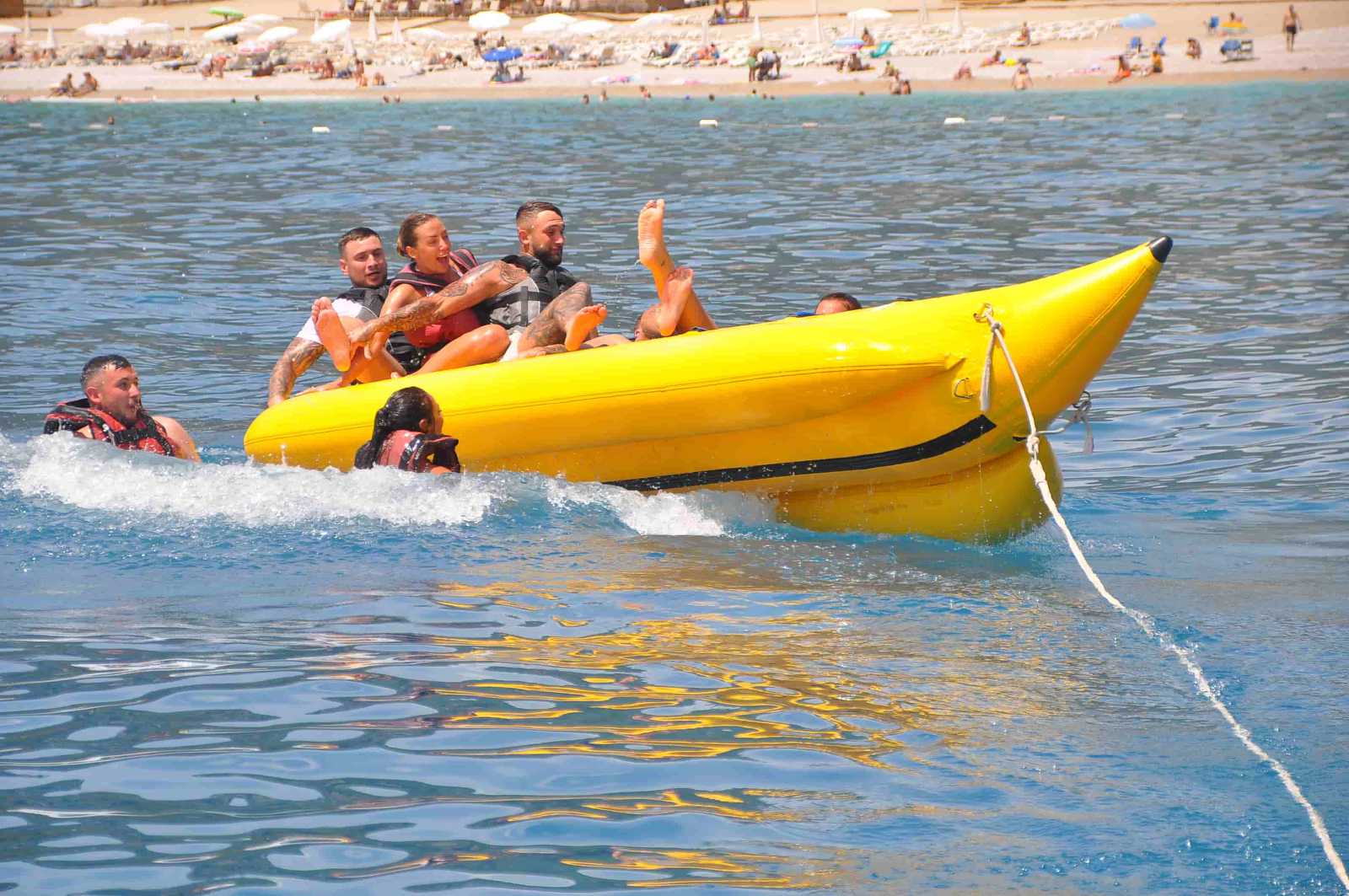 Adventure at Ölüdeniz Beach! Arrive at the beach whenever you wish, and our friendly guides will greet you with a quick safety briefing. Start your adventure with an exhilarating banana boat ride, where you’ll speed across the waves, laughing and screaming with joy as the boat makes thrilling twists and turns. After the ride, join in on some classic beach games like volleyball, frisbee, and tug-of-war, feeling the sand between your toes and the sun on your skin. Cool off with a swim in the crystal-clear waters of Ölüdeniz Beach, diving into the waves and enjoying the refreshing water. Take a break with a delicious picnic lunch on the beach, complete with fresh fruit, sandwiches, and cold drinks, all while soaking in the stunning views. Finish the day by channeling your inner architect with a sandcastle building contest. This Banana Beach Adventure at Ölüdeniz Beach promises a day of endless fun and unforgettable memories!