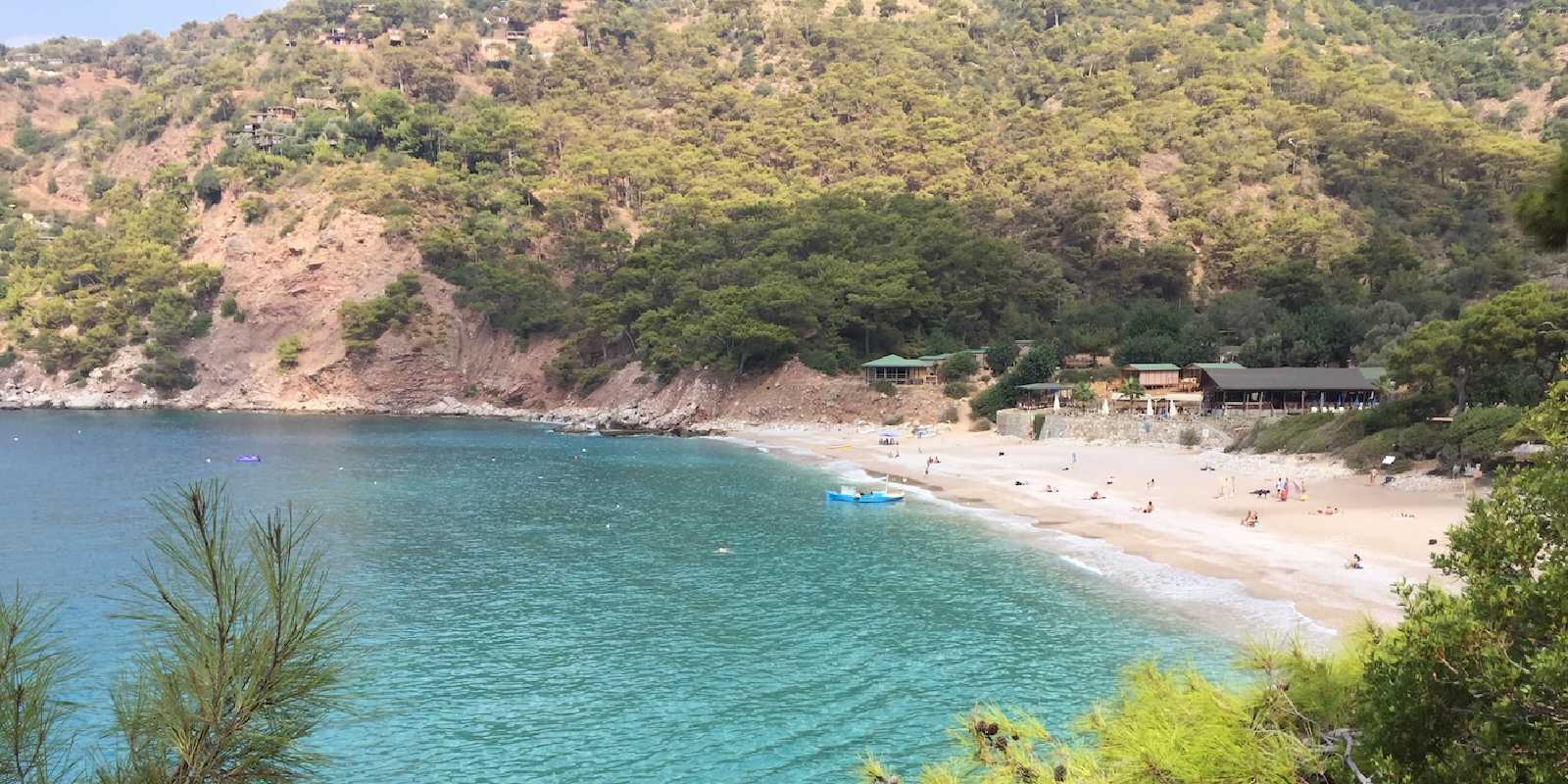 Kabak Bay, with its pristine sea and unforgettable landscapes, mesmerizes those who see it and is one of the most beloved places in the summer months. You can reach this paradise both by road and by sea. If you prefer to go by sea, renting a speedboat would be the most suitable choice. Located within the boundaries of Faralya Village in Fethiye, this bay has a captivating beauty. If you wish to stay in Kabak Bay, you can choose bungalows or guesthouses, or for a more adventurous stay, you can camp. Especially during the night, we highly recommend not to miss the unique view offered by the thousands of stars surrounding the sky. If your path leads you to this bay, we suggest visiting Aladere Waterfall (Kabak Waterfall). If you can’t find the beginning of the road to the waterfall on your way to the beach, you can ask anyone around. Along the road to the waterfall, you’ll find blue-white-red markings left with paint, guiding you throughout the way. At the beginning, a sign will assist you in choosing between a shorter but riskier path and a longer and safer one. The shorter one takes about half an hour, while the longer one takes about an hour. Along the waterfall trail, you’ll encounter plane trees and carob trees. It’s advisable to bring water and snacks with you for this walk, where you’ll be surrounded by unique nature. Kabak Bay, where you can see every shade of green and blue, despite having rough seas, stands out as a unique place with its cleanliness.