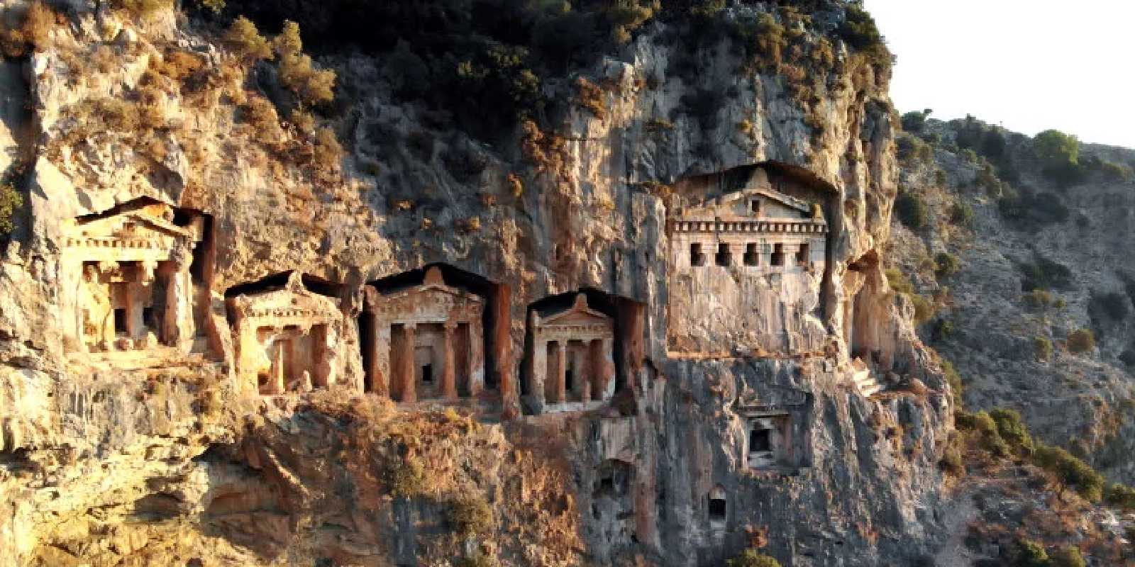 Dating back to the 6th century BCE, this city was founded within the boundaries of Lycia-Caria by Kaunos, one of the twin children of Miletus according to myth. The rock tombs, which can also be seen from Dalyan and have their origins dating back to the Urartians, were built in the 4th century BCE and later used in the Roman period as well. Among these rock tombs, there are three stone beds where the deceased were laid to rest. On the facade, there are two Ionian columns with friezes and pediments. One of the pediments features lion reliefs associated with the name of the city.